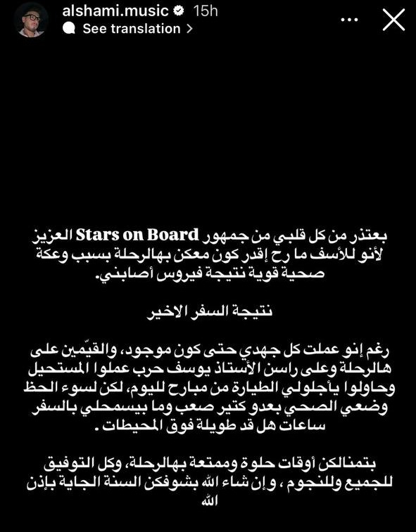 وأشار الشامي في منشور على حسابه الرسمي في "إنستجرام" إلى أنه حاول تأجيل السفر بمساعدة القائمين على الرحلة، إذ كتب: "عتذر من كل قلبي من جمهور Stars on Board العزيز لأنو للأسف ما رح إقدر كون معكن بهالرحلة بسبب وعكة صحية قوية نتيجة فيروس أصابني، نتيجة السفر الأخير، رغم إنو عملت كل جهدي حتى كون موجود، والقيمين على هالرحلة وعلى راسن الأستاذ يوسف حرب عملوا المستحيل وحاولوا يأجلولي الطيارة من مبارح لليوم".