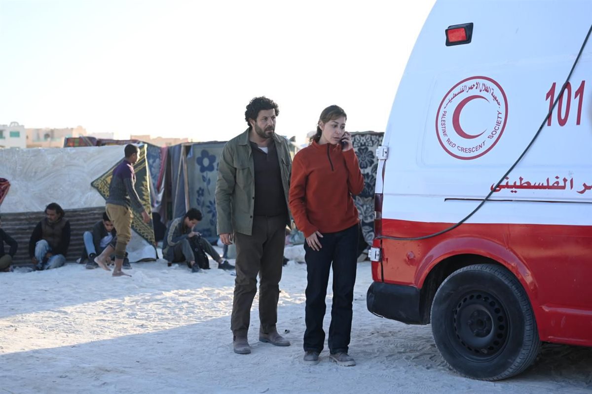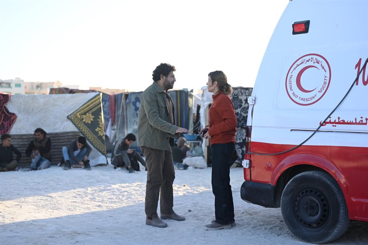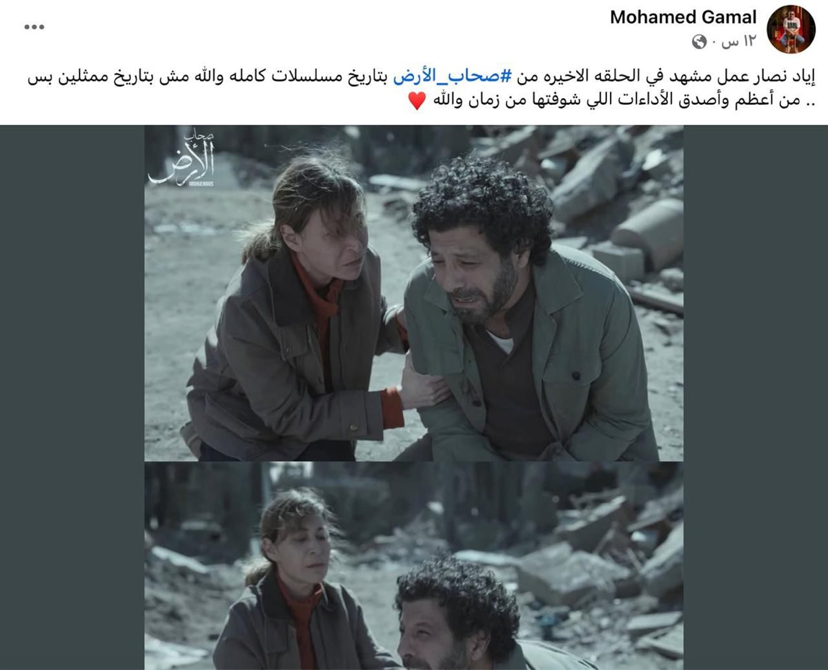 تناول مسلسل "صحاب الأرض" الواقع الإنساني المرير في غزة، حيث جسد إياد نصار دور رجل يسابق الزمن لإنقاذ ابن شقيقه وسط القصف، بينما ظهرت النجمة منة شلبي في دور طبيبة مصرية بقلب قافلة إغاثة.