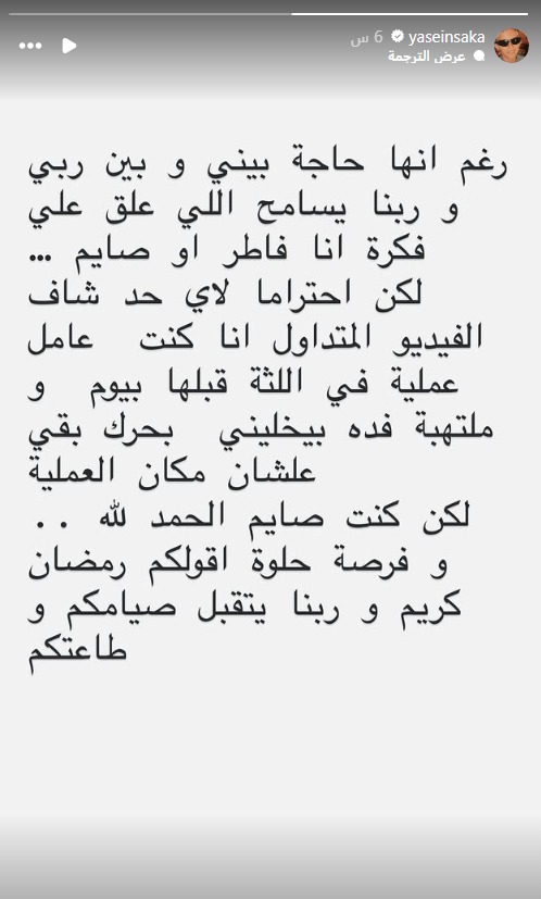 ياسين السقا يوضح حقيقة إفطاره في نهار رمضان