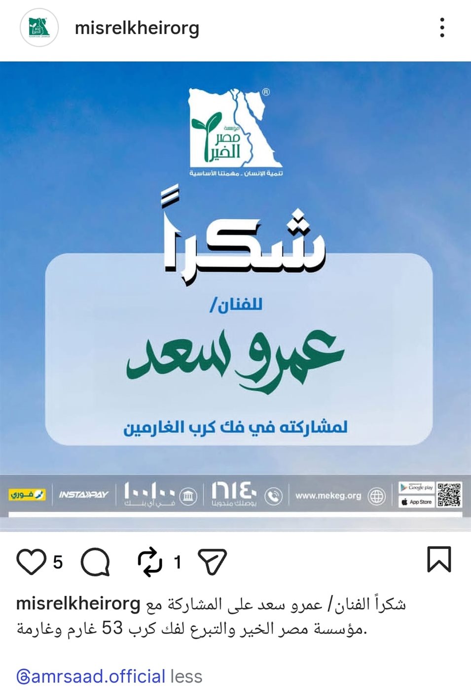 ونشرت الصفحة الرسمية للمؤسسة على موقع إنستجرام صورة تحمل عبارة: "شكراً للفنان عمرو سعد على المشاركة مع مؤسسة مصر الخير والتبرع لفك كرب 53 غارم وغارمة"، لتوثيق هذه المبادرة الإنسانية التي تعكس حرص الفنان على دعم المحتاجين.