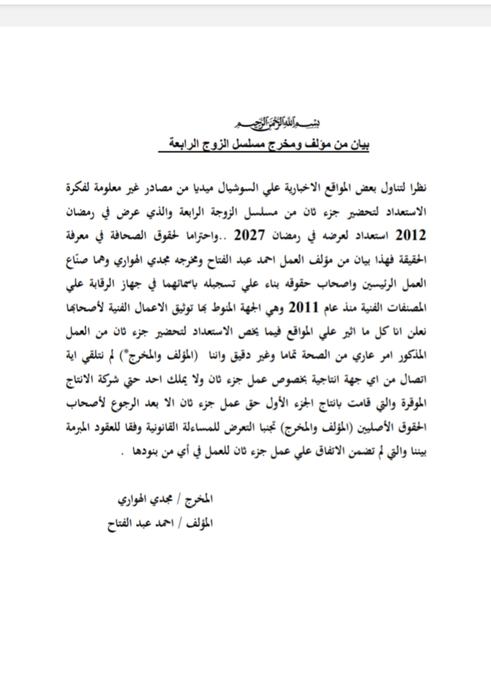 وقال المؤلف أحمد عبد الفتاح والمخرج مجدي الهواري في بيان مشترك: "نظرًا لتناول بعض المواقع الإخبارية على السوشيال ميديا، نقلًا عن مصادر غير معلومة، لفكرة الاستعداد لتحضير جزء ثانٍ من مسلسل الزوجة الرابعة، الذي عُرض في رمضان 2012، وذلك تمهيدًا لعرضه في رمضان 2027، وحرصًا منا على احترام حقوق الصحافة في معرفة الحقيقة، نؤكد أن هذه المعلومات غير صحيحة تمامًا".