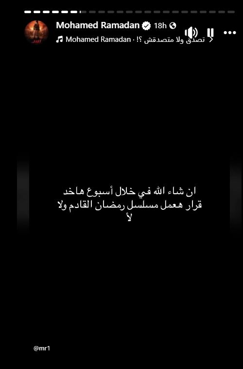 وكتب عبر حسابه على موقع فيسبوك: «إن شاء الله خلال أسبوع هاخد قرار هعمل مسلسل رمضان القادم ولا لا»، وهو ما فتح باب التكهنات حول عودته إلى المنافسة الرمضانية، خاصة في ظل النجاحات الكبيرة التي حققها في أعماله السابقة.