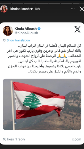 ونشرت كندة علوش كلمات حملت مشاعر الحزن والتعاطف، حيث دعت بالسلام والأمان للبنان وشعبه، مؤكدة مكانته الكبيرة في قلبها، واصفة إياه بأنه "غالي وحزين وقوي" في آن واحد.