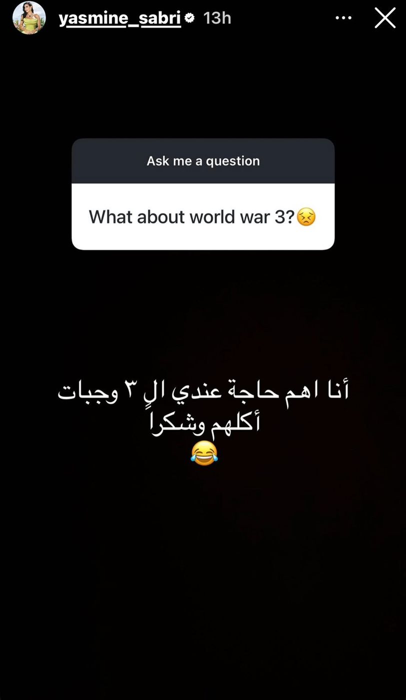 وفي تعليق على سؤال حول الحرب، أجابت ياسمين صبري بطريقتها الخاصة، وقالت: "أنا أهم حاجة عندي الـ 3 وجبات آكلهم وشكرًا"، وهو الرد الذي لاقى تفاعلًا كبيرًا عبر مواقع التواصل.