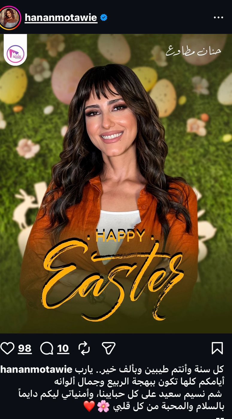ونشرت حنان مطاوع رسالة موجهة لمتابعيها قالت فيها: “كل سنة وأنتم طيبين وبألف خير يا رب، أيامكم كلها تكون ببهجة الربيع وجمال ألوانه، شم نسيم سعيد على كل حبايبنا، وأمنياتي ليكم دايماً بالسلام والمحبة من كل قلبي".