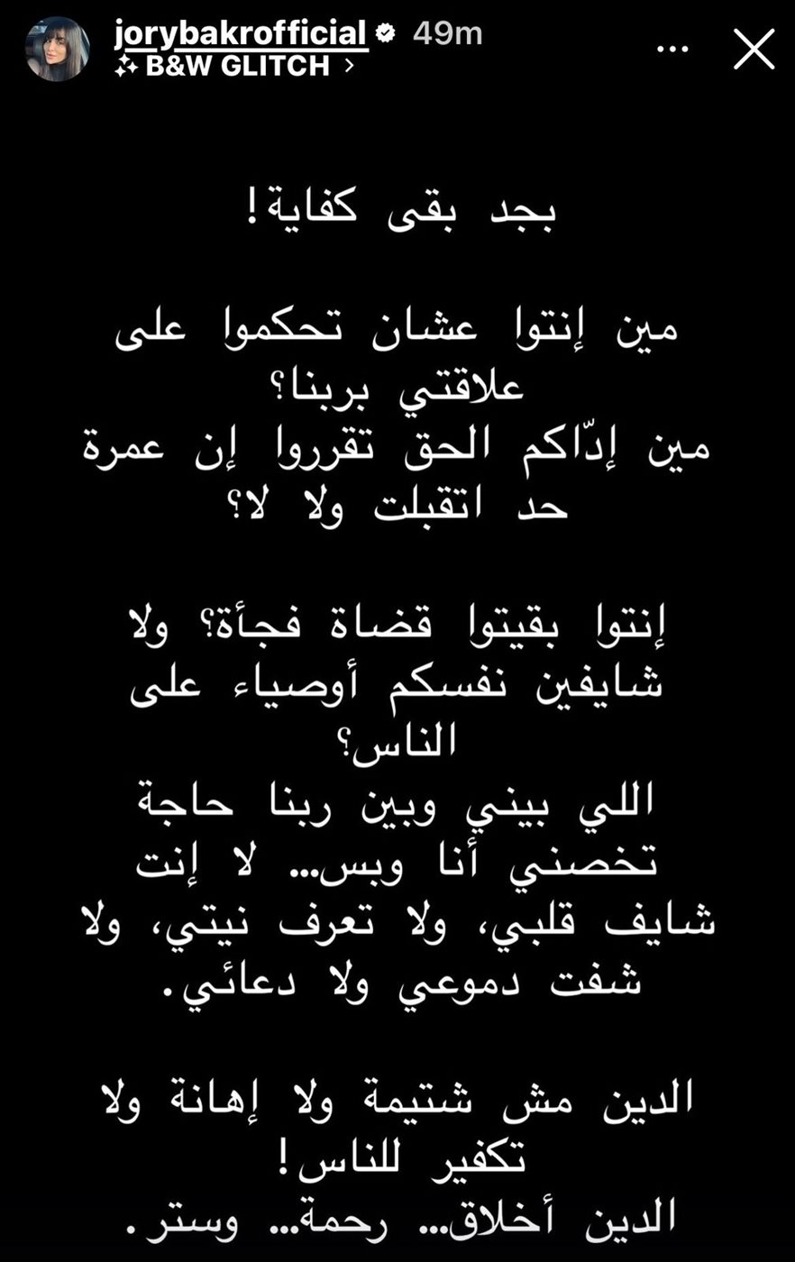 وقالت جوري في رسالتها: “كفاية بقى.. مين أنتوا علشان تحكموا على علاقتي بربنا؟ مين إدّاكم الحق تقرروا إن عمره حد اتقابلت ولا لأ؟ أنتوا بقيتوا قضاه فجأة؟ ولا شايفين نفسكم أوصياء على الناس؟”.