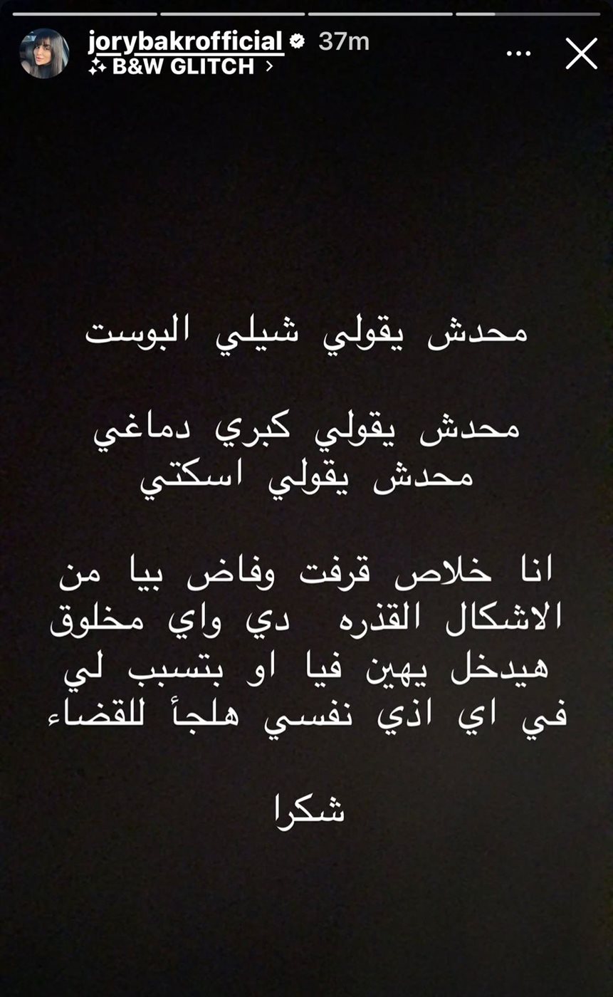 نشرت الفنانة جوري بكر رسالة مطولة عبر خاصية “الستوري” على حسابها الرسمي بموقع “إنستجرام”، وجهت خلالها هجومًا حادًا على بعض المتابعين بسبب تدخلهم في حياتها الشخصية والحكم عليها.