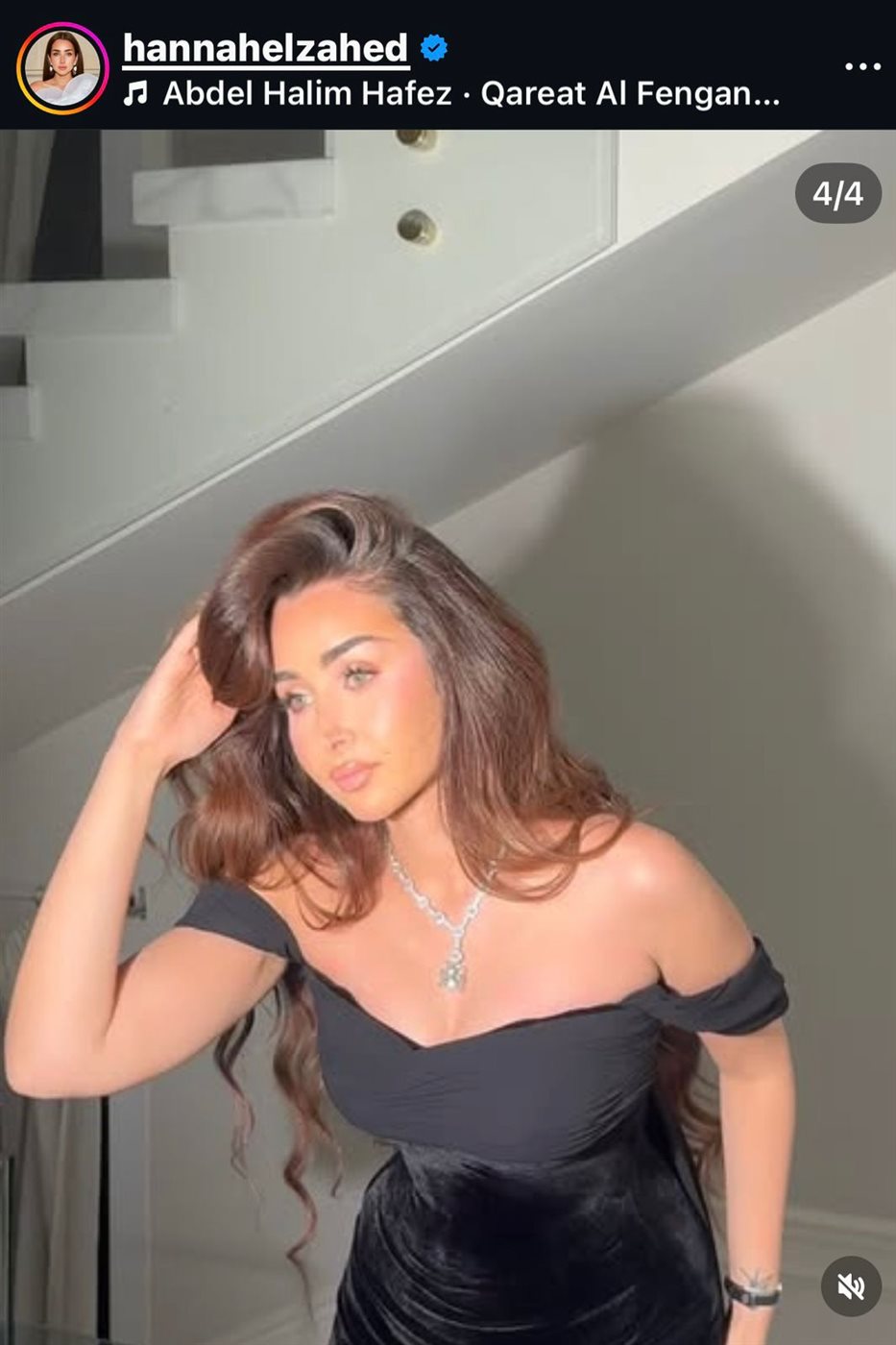 وظهرت هنا الزاهد في الصور مرتدية فستانًا من القطيفة الأسود بتصميم مستقيم أبرز رشاقتها، مع كاب طويل من الشفون الأسود، كما جاء الفستان بقصة صدر بتصميم "أوف شولدرمما أضفى لمسة من الرقي والجاذبية على إطلالتها.