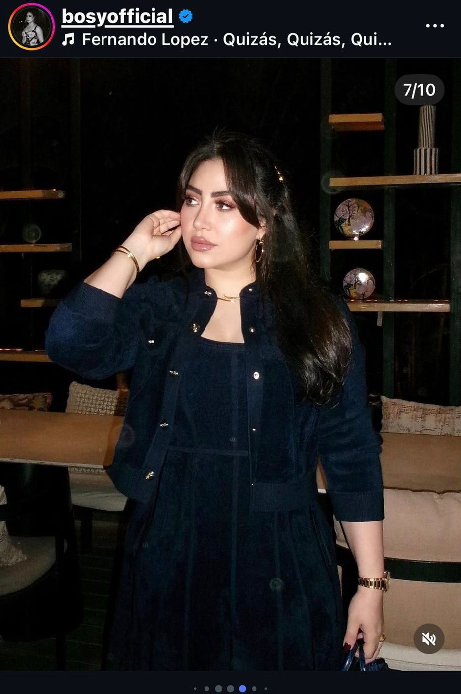 واعتمدت بوسي فستانًا باللون الأسود بتصميم A-line، ونسقت معه جاكيت قصير بنفس اللون مزين بأزرار ذهبية، ما أضفى لمسة راقية على مظهرها.