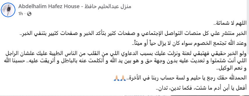 كما تضمن المنشور إشارات إلى أن الحكم في مثل هذه القضايا يبقى عند الله، سواء تأكدت صحة الخبر أو لم تتأكد، الأمر الذي زاد من حدة الجدل بين المتابعين على المنصات المختلفة، حيث أضافت: "ولو الخبر حقيقي فهتبقى لعنة ونزلت عليك بسبب الدعاوي اللي من القلب من الناس الطيبة عليك، علشان الراجل اللي أنت شتمتوا وتعديت عليه بدون وجه حق، وهو بين يد الله وأتكلمت عنه بالباطل وأتريقت عليه، حسبنا الله ونعم الوكيل، الحمد لله حقك رجع يا حليم ولسه حساب ربنا في الآخرة، أفعل يا أبن آدم ما شئت، فكما تدين وتدان".
