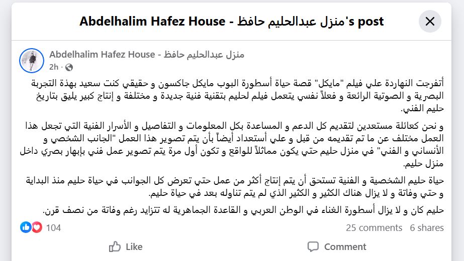 وكتبت أسرة العندليب عبر صفحتها الرسمية على موقع التواصل الاجتماعي "فيسبوك": "اتفرجت النهارده على فيلم مايكل قصة حياة أسطورة البوب مايكل جاكسون، وحقيقي كنت سعيد بهذه التجربة البصرية والصوتية الرائعة، وفعلاً نفسي يتعمل فيلم لحليم بتقنية فنية جديدة ومختلفة وإنتاج كبير يليق بتاريخ حليم الفني".