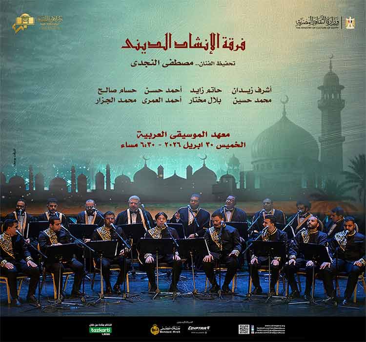 تنظم دار الأوبرا المصرية حفلاً مميزًا لفرقة الإنشاد الديني في السابعة والنصف مساء الخميس 30 أبريل، وذلك على مسرح معهد الموسيقى العربية، في أمسية فنية روحانية تحمل طابعًا وجدانيًا خاصًا.