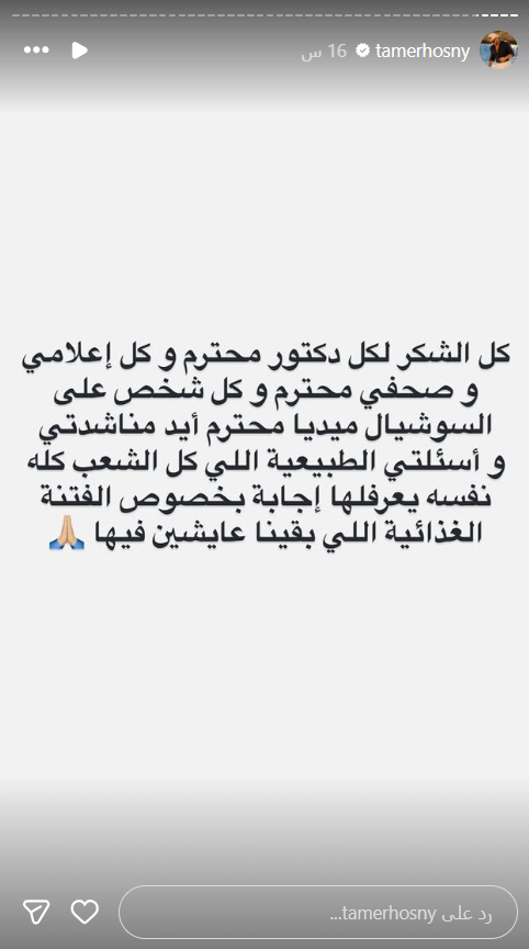 ونشر تامر حسني عبر حسابه الرسمي على موقع تبادل الصور والفيديوهات "إنستجرام"، من خلال خاصية "القصص القصيرة"، رسالة عبّر فيها عن امتنانه لكل من تفاعل مع حديثه ودعم طرحه، قائلاً: "كل الشكر لكل دكتور محترم وكل إعلامي وصحفي محترم وكل شخص على السوشيال ميديا محترم أيد مناشدتي وأسئلتي الطبيعية اللي كل الشعب نفسه يعرفلها إجابة بخصوص الفتنة الغذائية اللي بقينا عايشين فيها".