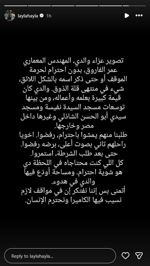وكتبت ليلى فاروق، في تعليق لها على الأزمة، من خلال خاصية "الاستوري" بحسابها الرسمي على "إنستجرام"، قائلة: "تصوير عزاء والدي، المهندس المعماري عمر الفاروق، بدون احترام لحرمة الموقف أو حتى ذكر اسمه بالشكل اللائق شيء في منتهى قلة الذوق، والدي كان قيمة كبيرة بعلمه وأعماله، ومن بينها توسعات مسجد السيدة نفيسة ومسجد سيدي أبو الحسن الشاذلي وغيرها داخل مصر وخارجها".