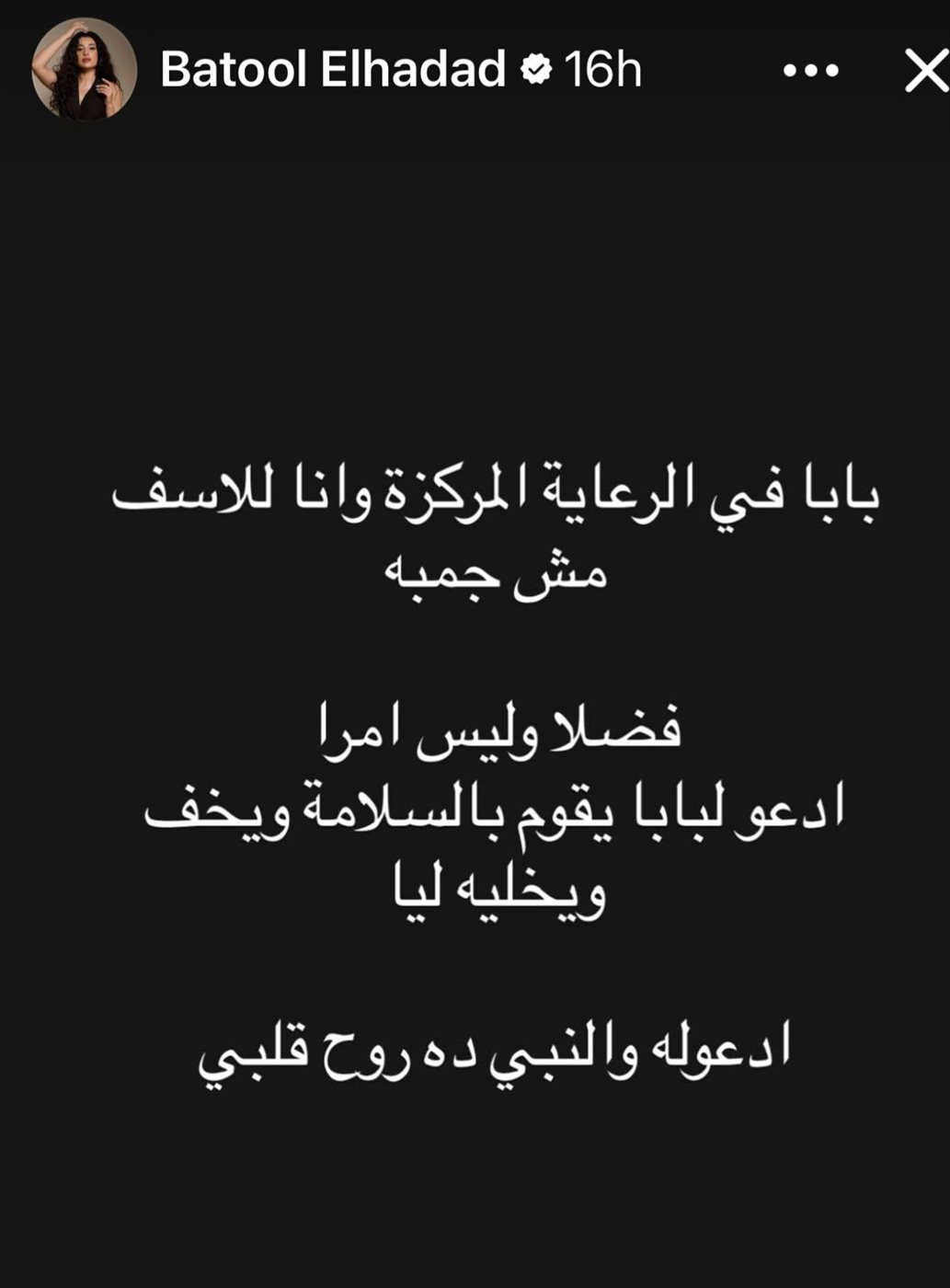 وكتبت بتول الحداد عبر خاصية الستوري على حسابتها الرسمية على مواقع التواصل الاجتماعي “فيسبوك وإنستجرام”: “بابا في العناية المركزة وأنا للأسف مش جنبه، فضلًا ادعوا له يقوم بالسلامة ويخف ويخليه ليا، ادعوا له والنبي دا روح قلبي”