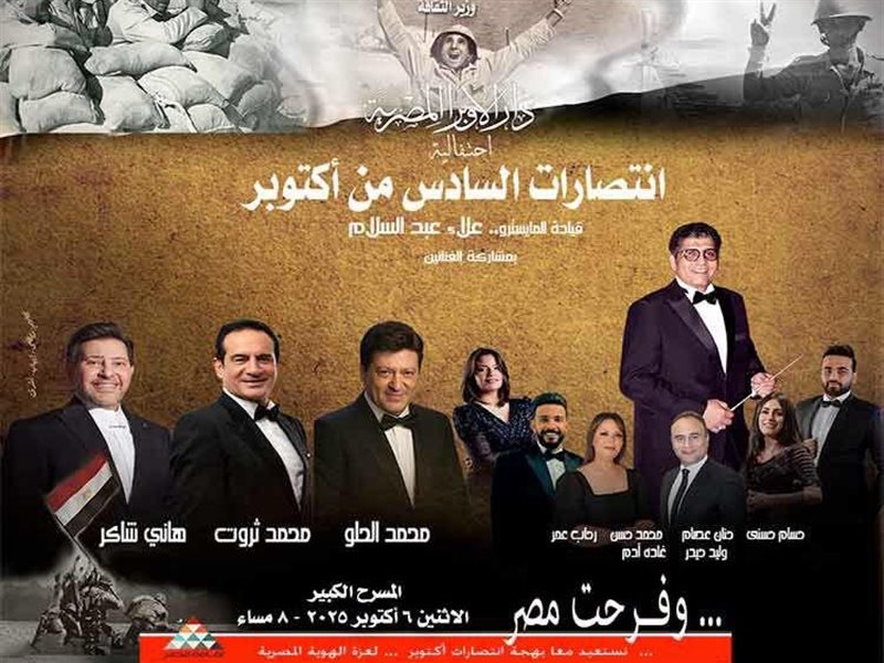 تحت رعاية الدكتور أحمد فؤاد هنو وزير الثقافة يقود المايسترو الدكتور علاء عبد السلام رئيس دار الأوبرا المصرية الاحتفالية الضخمة المقامة بمناسبة ذكرى انتصارات السادس من أكتوبر والتى تحمل شعار وفرحت مصر ويحييها النجوم محمد الحلو، محمد ثروت، هانى شاكر بمشاركة مطربى الموسيقى العربية بالأوبرا حسام حسنى، حنان عصام، محمد حسن، رحاب عمر، وليد حيدر، غادة آدم وذلك فى الثامنة مساء الأثنين 6 اكتوبر على المسرح الكبير .