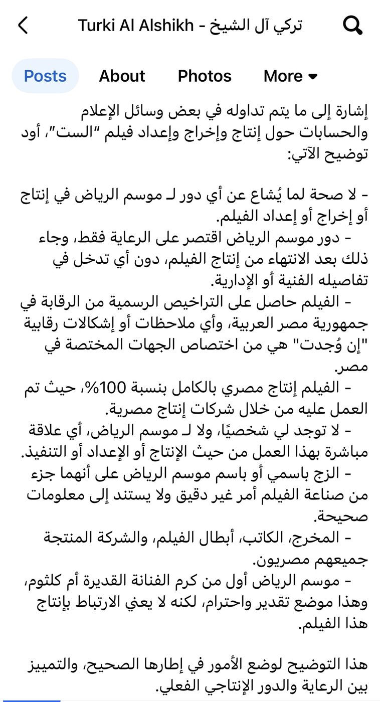 وقال: «المخرج، الكاتب، أبطال الفيلم، والشركة المنتجة جميعهم مصريون.. موسم الرياض أول من كرم الفنانة القديرة أم كلثوم، وهذا موضع تقدير واحترام، لكنه لا يعني الارتباط بإنتاج هذا الفيلم.»