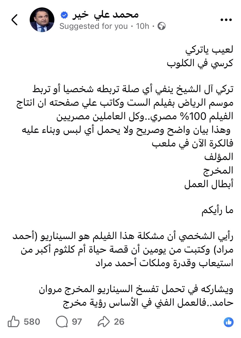 علَّق الإعلامي محمد علي خير علي بيان المستشار تركي آل الشيخ، والذي أكد من خلاله على عدم وجود أي صلة شخصية له أو لموسم الرياض بفيلم «الست»، مشددًا عبر صفحته الرسمية على أن إنتاج الفيلم مصري بنسبة 100%، وجميع العاملين به مصريون.