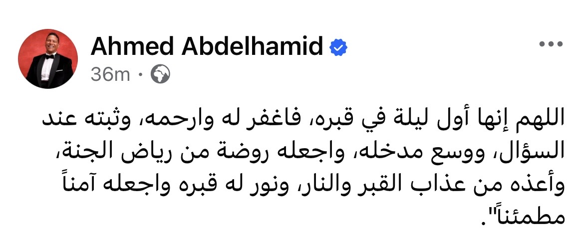 ونشر أحمد عبد الحميد عبر حسابه الرسمي على موقع «فيسبوك» دعاءً مؤثرًا، جاء فيه: «اللهم إنها أول ليلة في قبره، فاغفر له وارحمه، وثبته عند السؤال، ووسع مدخله، واجعله روضة من رياض الجنة، وأعذه من عذاب القبر والنار، ونوّر له قبره واجعله آمنًا مطمئنًا».