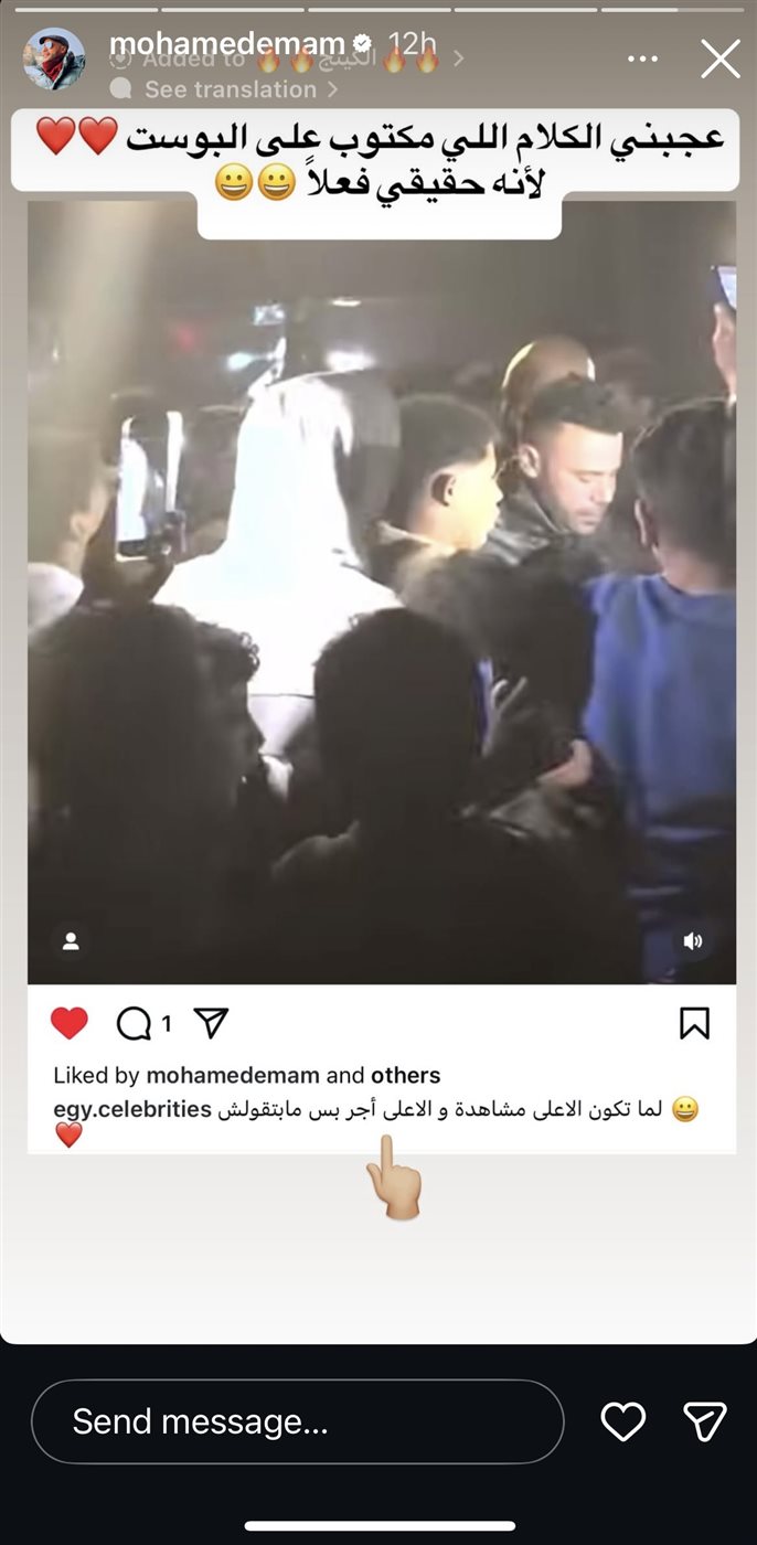 ونشر محمد إمام ردّه عبر خاصية «الاستوري»، حيث علّق على المنشور قائلًا: «عجبني الكلام اللي مكتوب على البوست لأنه حقيقي فعلًا»، في تعليق مباشر يعكس ثقته في نجاحاته الفنية خلال الفترة الأخيرة.