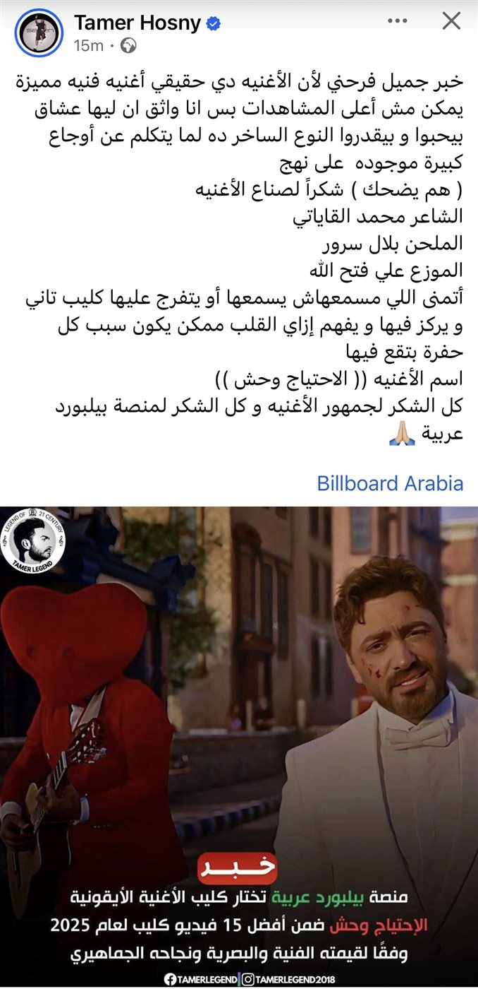 عبّر الفنان تامر حسني عن سعادته الكبيرة باختيار أغنيته «الاحتياج وحش» ضمن قائمة أفضل 15 فيديو كليب خلال عام 2025، وذلك وفق تصنيف منصة بيلبورد عربية، مؤكدًا أن العمل الفني الحقيقي لا يُقاس فقط بعدد المشاهدات، بل بمدى تأثيره وصدق رسالته.