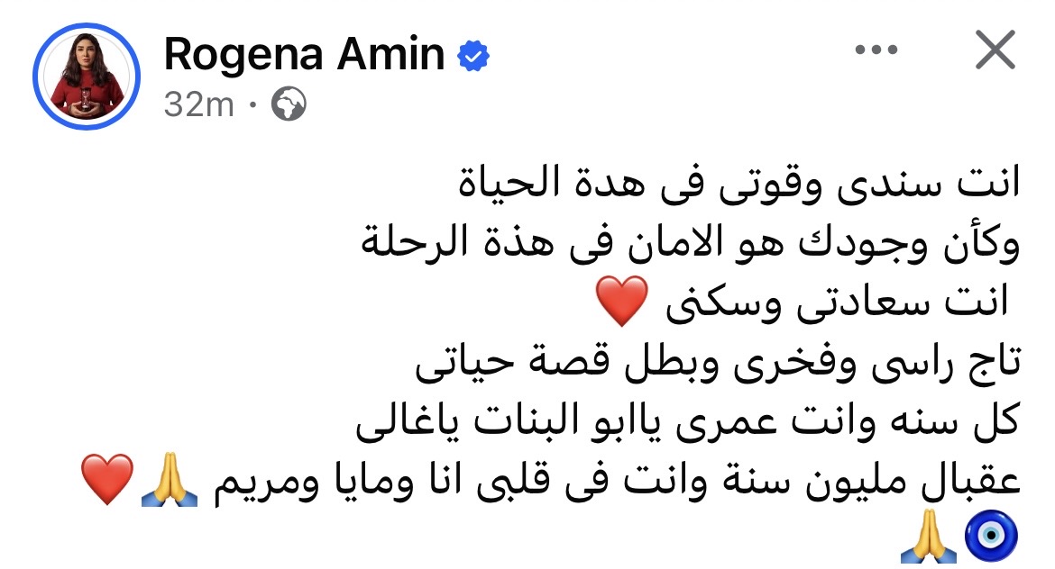 شاركت روجينا جمهورها بعدد من الصور العائلية، وعلّقت قائلة: «أنت سندي وقوتي في هذه الحياة، وكأن وجودك هو الأمان في هذه الرحلة، أنت سعادتي وسكني».