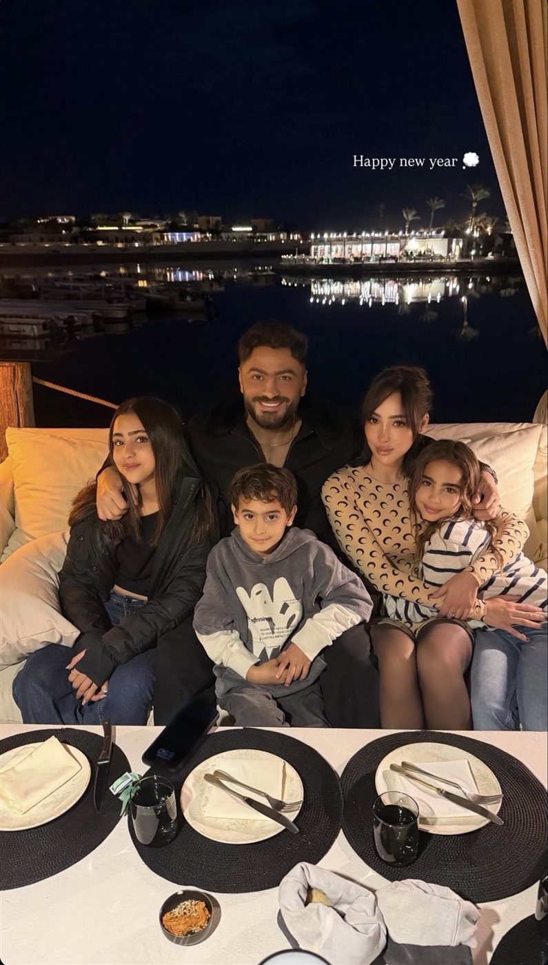 وظهرت بسمة بوسيل في الصورة برفقة أبنائها، وبحضور الفنان تامر حسني، وذلك احتفالًا بحلول العام الجديد، في مشهد عكس أجواء من الود والترابط الأسري، رغم انفصالهما الرسمي.