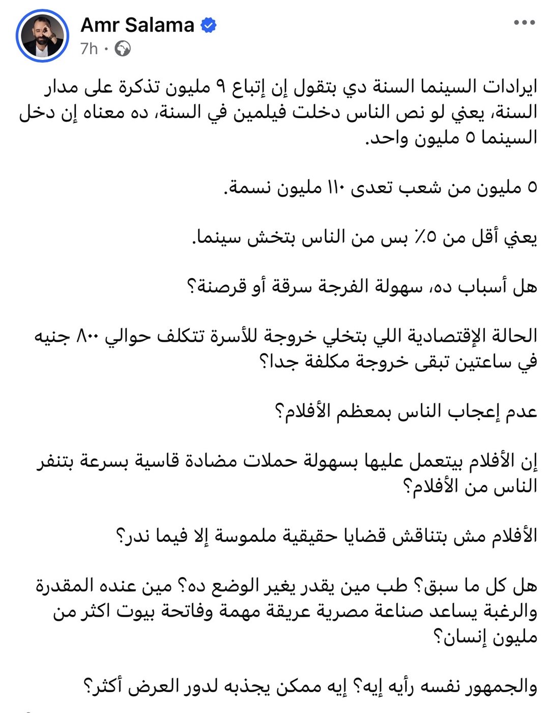 كتب عمرو سلامة، في منشوره: "5 ملايين شخص من أصل 110 مليون نسمة دخلوا السينما، أي أن نسبة الحضور الفعلي أقل من 5٪ فقط من الشعب المصري".