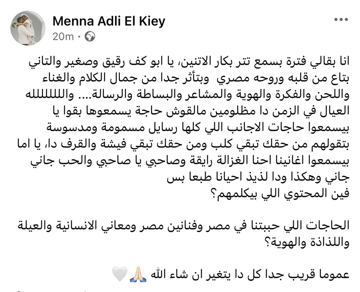 وأضافت: "يا اما بيسمعوا اغانينا احنا الغزالة رايقة وصاحبي يا صاحبي والحب جاني جاني وهكذا ودا لذيذ احيانا طبعا بس فين المحتوي اللي بيكلمهم؟ الحاجات اللي حببتنا في مصر وفنانين مصر ومعاني الانسانية والعيلة واللذاذة والهوية؟".
