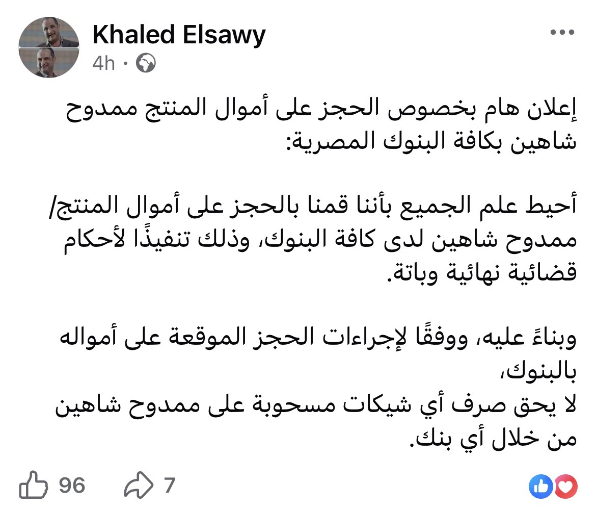وقال الفنان خالد الصاوي حرفيًا عبر صفحته الرسمية على «فيس بوك»: “إعلان هام بخصوص الحجز على أموال المنتج ممدوح شاهين بكافة البنوك المصرية:
