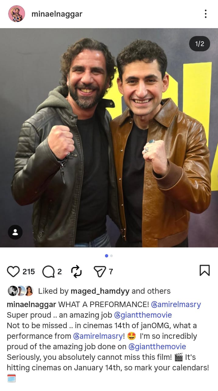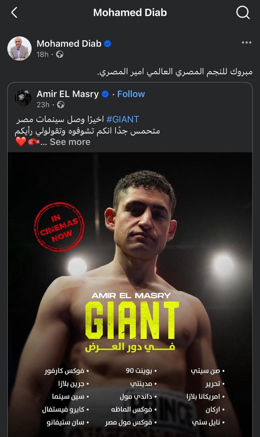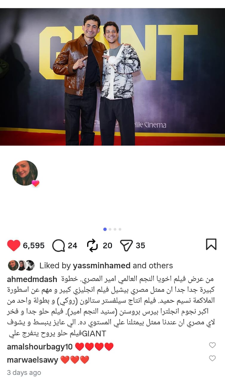أبرزهم محمد دياب وأحمد داش وعمرو عابد.. نجوم الفن يشجعوا على مشاهدة فيلم giant لأمير المصري