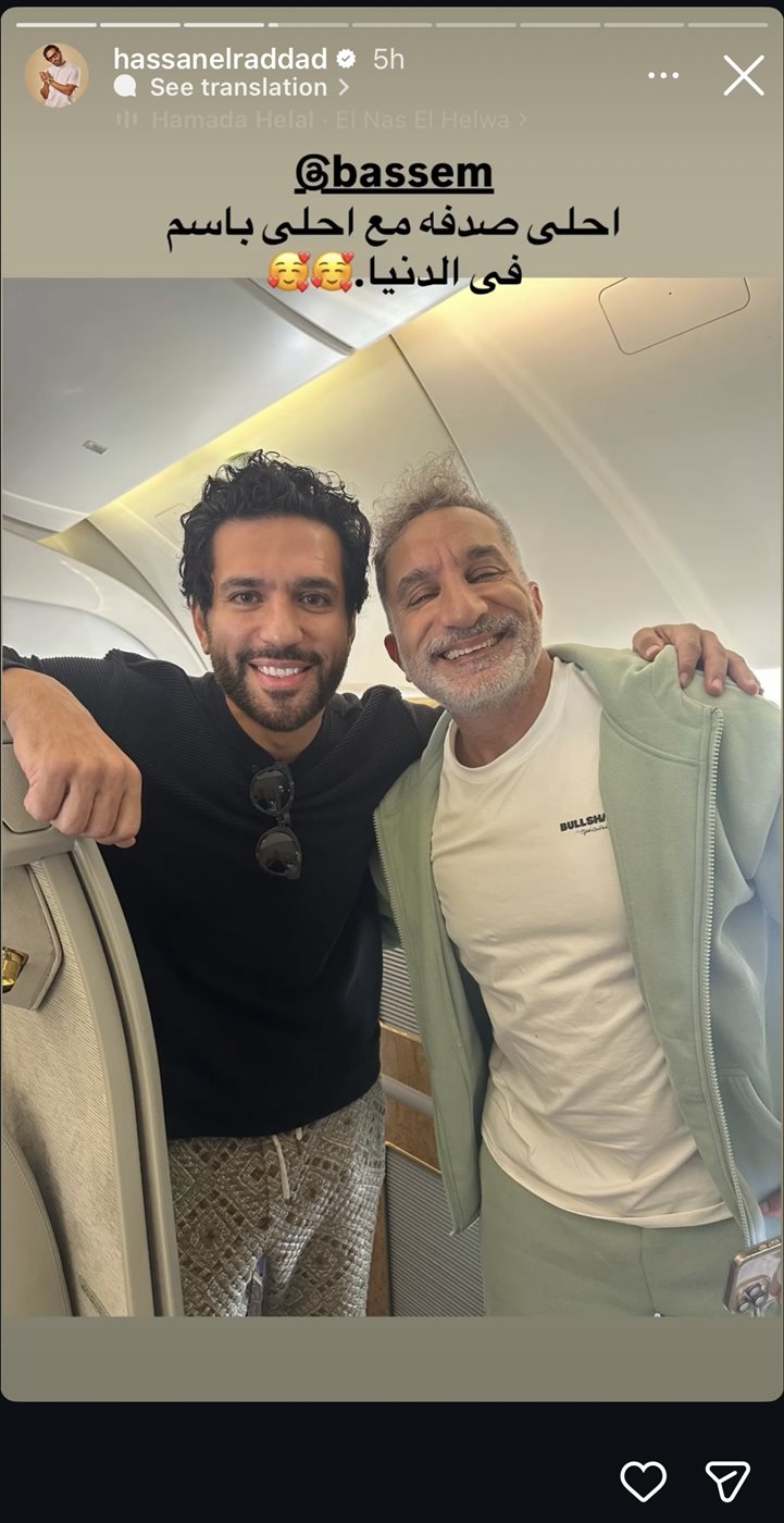وبدأت حالة التفاعل بنشر الفنان حسن الرداد صورة عبر حسابه الرسمي على "إنستجرام"، ظهر فيها رفقة الإعلامي باسم يوسف داخل طائرة، وبدت الأجواء بينهما مليئة بالود والبهجة.