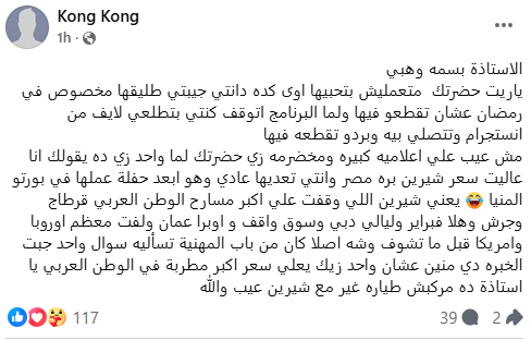 وتابع قائلاً: «مش عيب على إعلامية كبيرة ومخضرمة زي حضرتك، لما شخص زي ده يقولك أنا علّيت سعر شيرين بره مصر، وتعدّي الكلام عادي؟ وهو أبعد حفلة عملها كانت في بورتو المنيا».