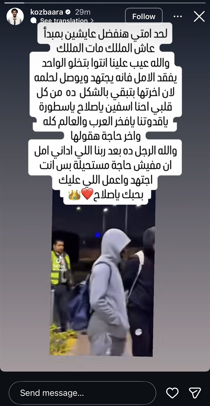 ودافع كزبرة، عن صلاح من خلال منشور له عبر خاصية "الاستوري" بحسابه الرسمي على "إنستجرام"، قال من خلاله: "لحد امتى هنفضل عايشين بمبدأ عاش الملك مات الملك والله عيب علينا انتوا بتخلوا الواحد يفقد الأمل فانه يجتهد ويوصل لحلمه لان اخرتها بتبقى بالشكل ده".