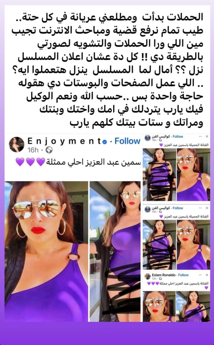 ونشرت ياسمين مجموعة من المنشورات المسيئة لها لتلك الصفحات، محذرة جمهورها من الانسياق وراء هذه المنشورات المضللة.