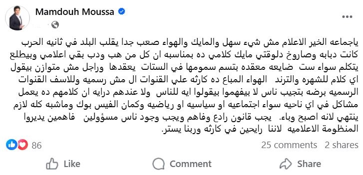 وشدد ممدوح موسى على أن منصات التواصل الاجتماعي، وعلى رأسها فيسبوك، أصبحت تمثل وباءً إعلاميًا، داعيًا إلى وضع قوانين رادعة وفعّالة لتنظيم العمل الإعلامي، مع ضرورة وجود فرق إدارة إعلامية مسؤولة وذات خبرة تضمن الاحترافية والمهنية في التغطية الإعلامية، موضحا أن تجاهل هذه الأمور قد يؤدي إلى كارثة حقيقية إذا لم يتم التعامل معها بشكل عاجل ومنظم.