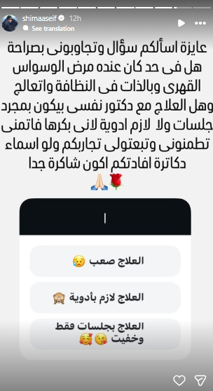 وطلبت شيماء سيف المساعدة من جمهورها، في منشور لها من خلال خاصية "الاستوري" عبر حسابها الرسمي على موقع إنستجرام، كتبت شيماء سيف: "عايزة اسألكم سؤال وتجاوبوني بصراحة، هل في حد كان عنده مرض الوسواس القهري، وبالذات في النظافة، واتعالج؟ هل العلاج مع دكتور نفسي بيكون بمجرد جلسات، ولا لازم أدوية؟ لأني بكرهها".