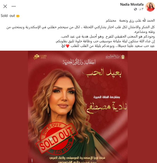 «الحمد لله على رزق ونعمة محبتكم.. كل الشكر والامتنان لكل قلب اختار يشاركني اللحظة.. لكل من سيحضر حفلتي في الإسكندرية ويمنحني من وقته ومشاعره، وجودكم هو المعنى الحقيقي للفرح وهو أجمل هدية في عيد الحب.. إن شاء الله ستكون ليلة مليانة موسيقى حب وطاقة حلوة تليق بقلوبكم، وبوعدكم بليلة من القلب للقلب».