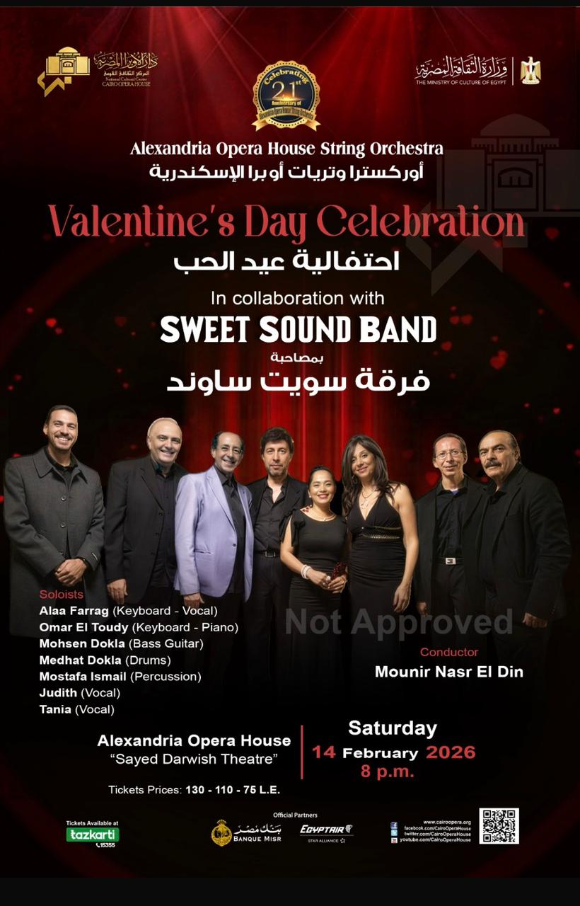 ضمن احتفالات دار الأوبرا المصرية برئاسة الدكتور علاء عبد السلام بمناسبة عيد الحب، تستضيف أوبرا الإسكندرية حفلاً مميزًا يحييه أوركسترا وتريات أوبرا الإسكندرية بمشاركة فرقة «سويت ساوند»، بقيادة المايسترو منير نصر الدين، وذلك في الثامنة مساء السبت 14 فبراير على مسرح سيد درويش «أوبرا الإسكندرية».