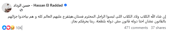 وكتب حسن الرداد، فيه منشوره: "إن شاء الله الكلاب ولاد الكلاب اللى لبسوا الراجل المحترم فستان، هيتفرج عليهم العالم كله و هم بياخدوا جزائهم بالقانون عشان احنا دوله قانون مش دوله بلطجة، ربنا يحرقكم بجاز".