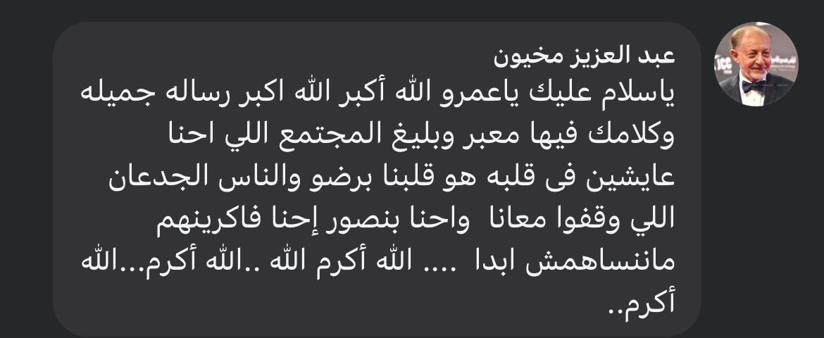 وعلق عبد العزيز مخيون على فيديو نشره عمرو سعد عبر حسابه على "فيسبوك"، كاتبًا: "يا سلام عليك يا عمرو، رسالة جميلة وكلامك بليغ المجتمع الذي نعيش فيه هو قلبنا أيضًا، والناس الذين وقفوا معنا أثناء التصوير لن ننساهم أبدًا الله أكرم".