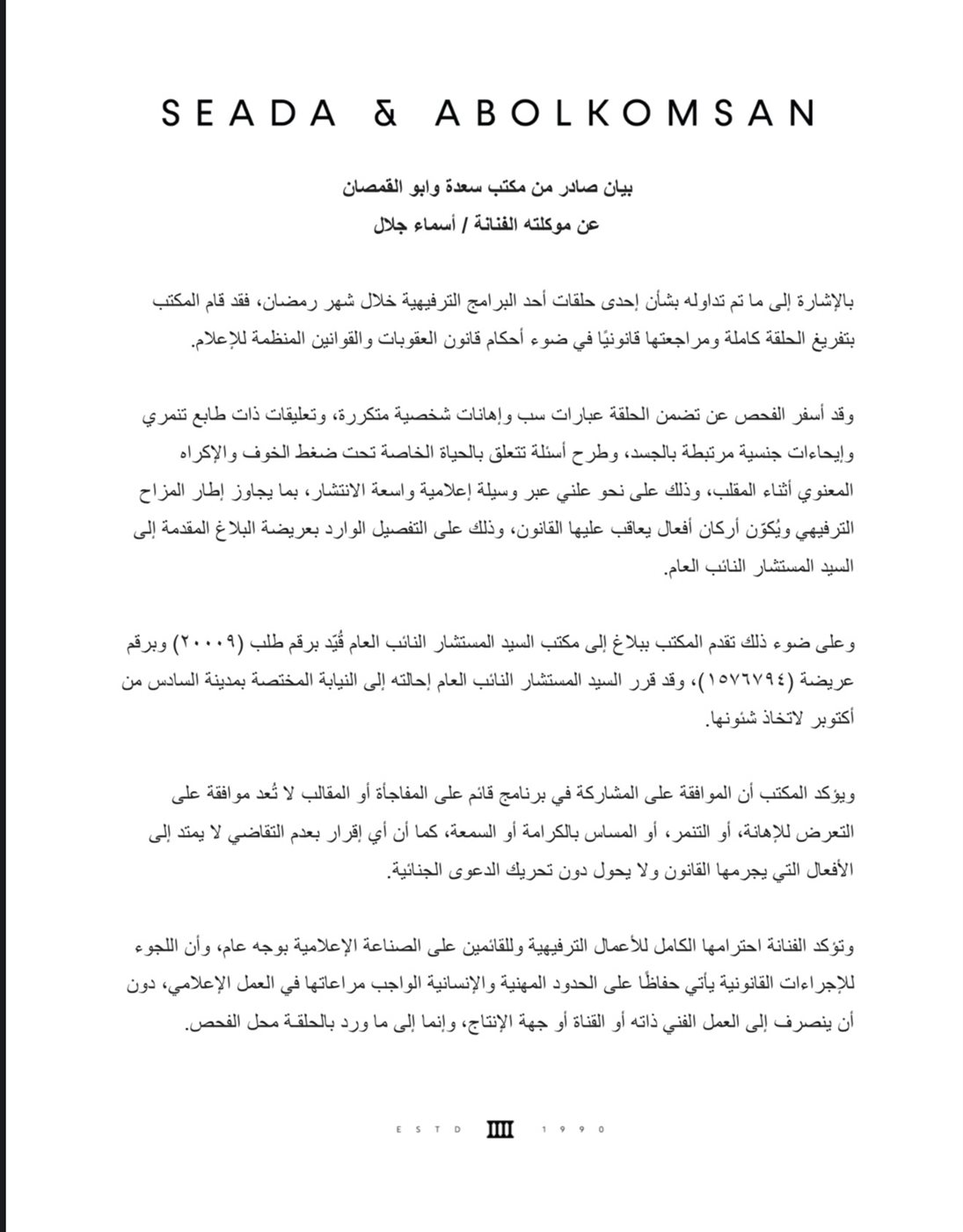وأصدرت المحامية نهاد أبو القمصان بيانًا صحفيًا، أكدت فيه أن فريقها القانوني قام بتفريغ الحلقة الأولى من البرنامج، والتي حلت فيها أسماء جلال ضيفة، لمراجعتها وفقاً لقانون العقوبات والقوانين المنظمة للإعلام. وأسفر الفحص القانوني عن رصد عدة مخالفات جسيمة، شملت عبارات سب وإهانات شخصية: تكررت بشكل علني خلال الحلقة.