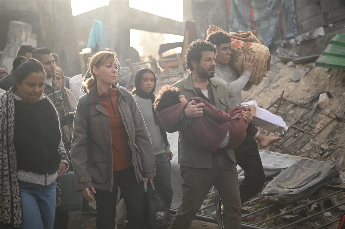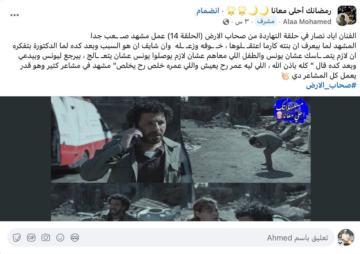 تناول مسلسل "صحاب الأرض" الواقع الإنساني المرير في غزة، حيث جسد إياد نصار دور رجل يسابق الزمن لإنقاذ ابن شقيقه وسط القصف، بينما ظهرت النجمة منة شلبي في دور طبيبة مصرية بقلب قافلة إغاثة.