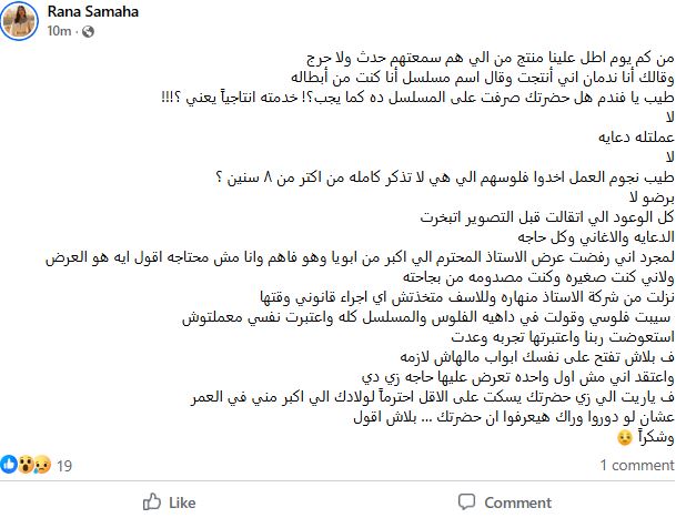 وقالت رنا سماحة في تعليق لها على تصريحات المنتج، من خلال منشور لها عبر حسابها على "فيسبوك": "من كم يوم أطل علينا منتج من اللي هم سمعتهم حدث ولا حرج، وقالك أنا ندمان إني أنتجت وقال اسم مسلسل أنا كنت من أبطاله طيب يا فندم هل حضرتك صرفت على المسلسل ده كما يجب؟! خدمته إنتاجيًا يعني ؟!!!لا".