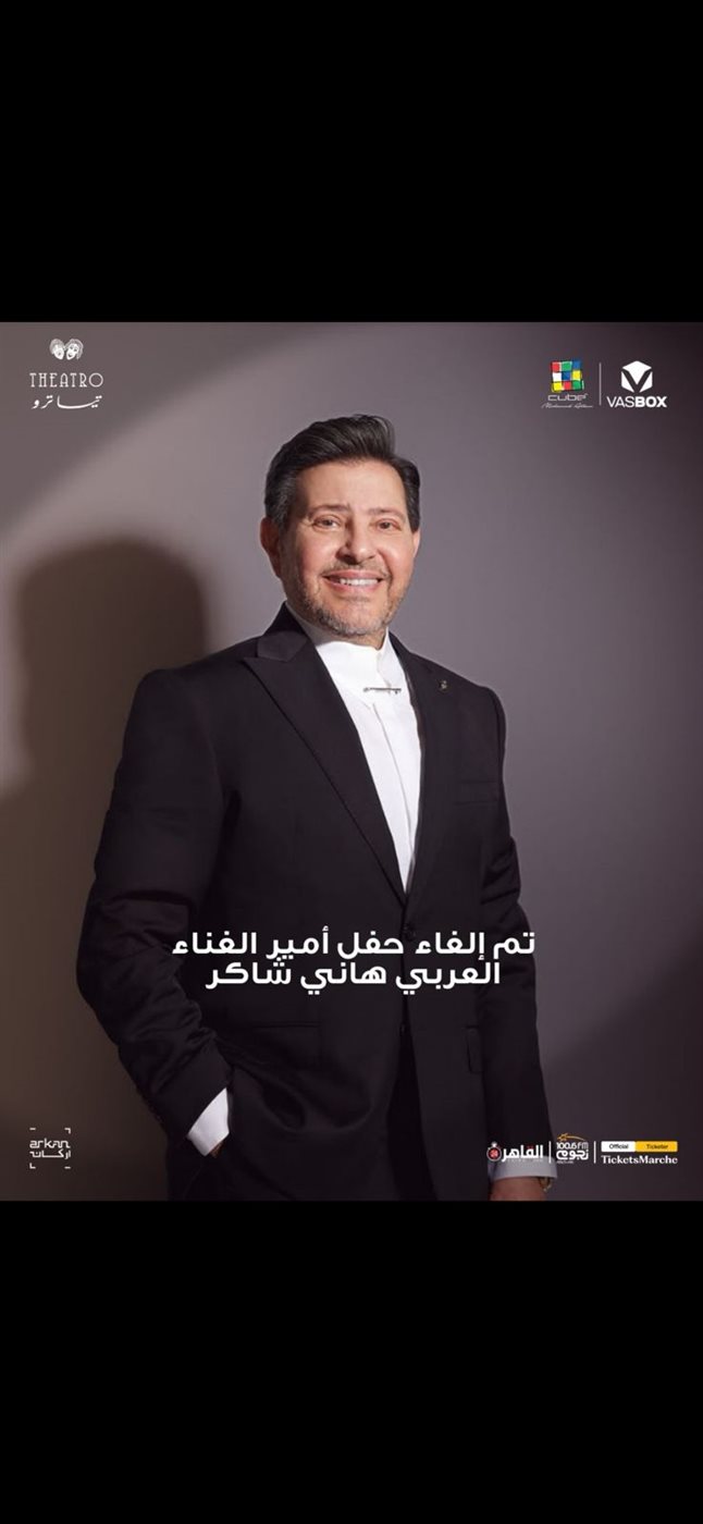 أعلنت شركتا VAS BOX وكيوب ميوزك رسميًا عن إلغاء حفل هاني شاكر، أمير الغناء العربي، الذي كان مقررًا إقامته يوم الخميس 2 أبريل على مسرح تياترو أركان، وذلك بسبب ظروفه الصحية التي حالت دون إتمام الحفل.