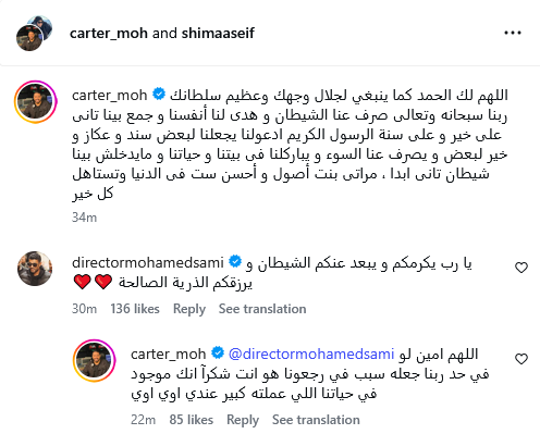 وحرص محمد سامي على تهنئة شيماء سيف ومحمد كارتر، عقب إعلان الأخير الصلح مع طليقته وذلك من خلال التعليقات على منشور العودة، داعيا لهما بالتوفيق، حيث قال سامي: "يا رب يكرمكم ويبعد عنكم الشيطان ويرزقكم الذرية الصالحة".