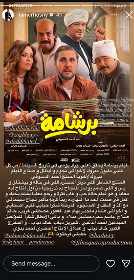 أشاد النجم تامر حسني بفيلم "برشامة"، وذلك عقب طرحه في دور العرض المصرية مع أول أيام عيد الفطر، حيث عبر عن رأيه عبر خاصية "الاستوري" من خلال حسابه الرسمي على تطبيق "إنستجرام".