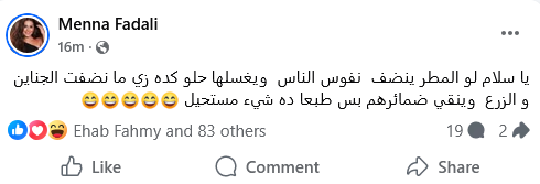 وجاءت كلمات منة فضالي بطابع تأملي يحمل دلالات إنسانية، حيث كتبت: "يا سلام لو المطر ينضف نفوس الناس ويغسلها حلو كده زي ما نضفت الجناين والزرع وينقى ضمائرهم بس طبعا ده شيء مستحيل".