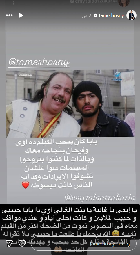 ورد تامر حسني على إيمي قائلاً: "يا إيمي يا غالية يا بنت الغالي أوي دا بابا حبيبي وحبيب الملايين وكانت أحلى أيام وعندي مواقف معاه في التصوير تموت من الضحك أكثر من الفيلم نفسه والله يرحمك يا طلعت يا حبيبي يلا نقرأ له الفاتحة".