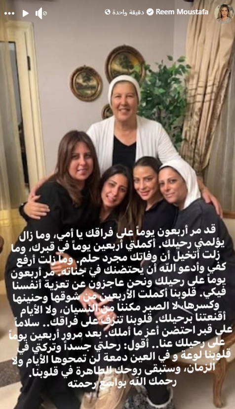 ونشرت ريم مصطفى صورة جمعتها بشقيقاتها اللواتي يعيشن مشاعر الفقد والحزن أيضا، وذلك عبر خاصية "الاستوري" على حسابها الرسمي بموقع "إنستجرام"، ورافقتها برسالة مؤثرة، قالت فيها: "مر أربعون يومًا على فراقك يا أمي، وما زال يؤلمني رحيلك، أكملتي أربعين يومًا في قبرك، وما زلت أتخيل أن وفاتك مجرد حلم، وما زلت أرفع كفي وأدعو الله أن يحتضنك في جناته".